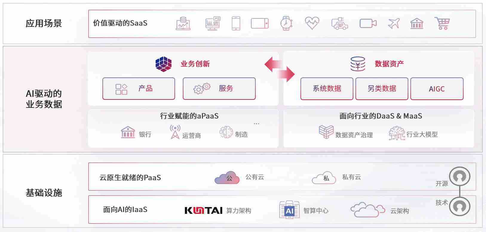 数字时代,,,,围绕企业数字化转型的关键要素,,,伟德国际1946bv数码开创性的提出数云融合战略和技术体系框架,,着力在云原生、、、、数字原生、、AI原生和信创产业上架构产品和服务能力,,,,为处在不同数字化转型阶段的快消零售、、、汽车、、、、金融、、医疗、、、政企、、教育、、、、运营商等行业客户提供泛在的敏捷IT能力和融合的数据驱动能力,,,构建跨界融合创新的数字业务场景和新业务模式,,,助力企业级客户建立面向未来的核心能力和竞争优势,,,全面推动社会的数字化、、、智能化转型升级。。。。